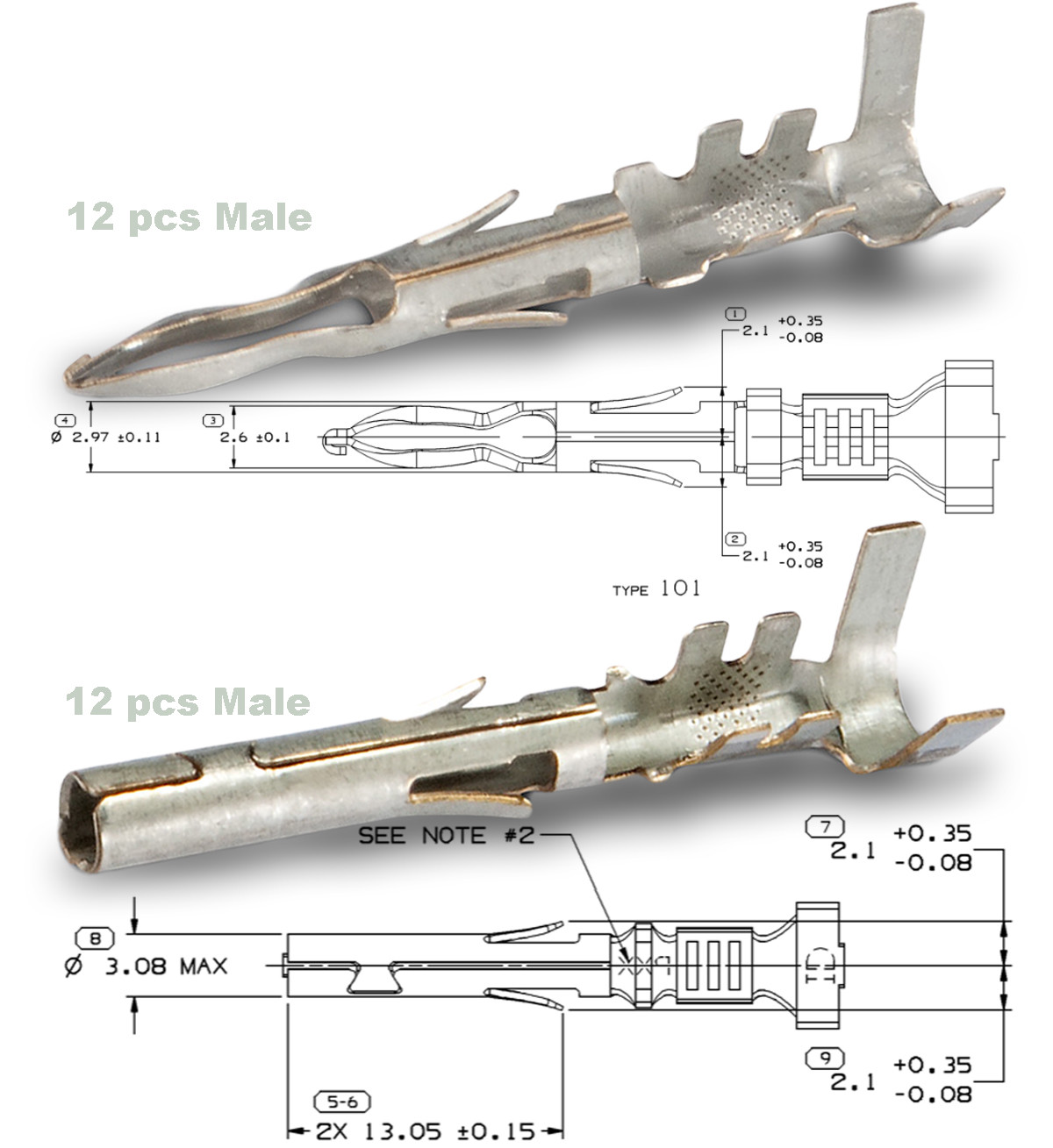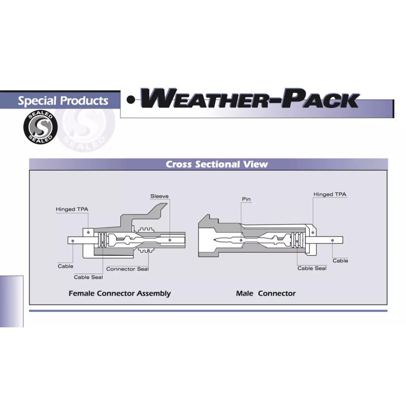 Description : | Weather Pack Male & Female Sealed Tin Plating Tang Terminal, Cable Range 1.00 - 2.00 mm2 |