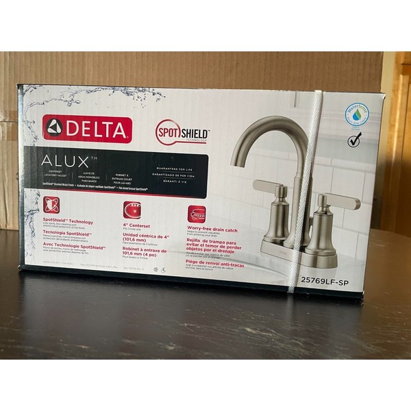 For sale is a brand new, never used, open box Delta 25769LF-SP Alux SpotShield Brushed Nickel 2-handle 4-in Centerset Bathroom fauchet in Brushed Nickel Finish. Shipped via UPS Ground