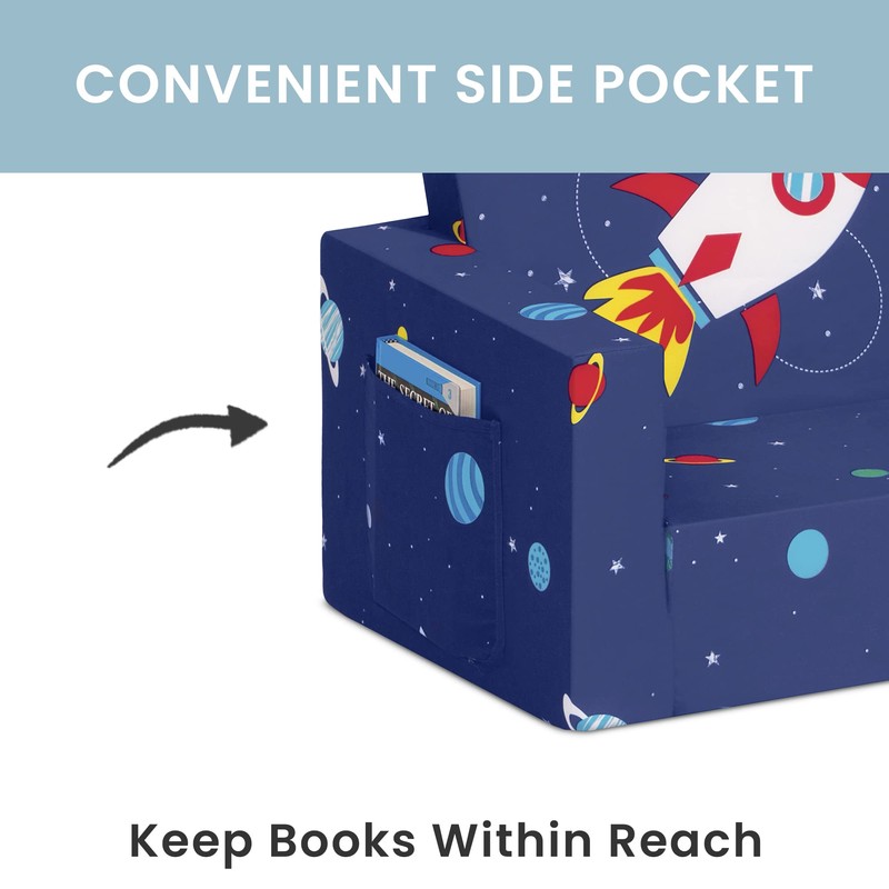 Delta Children Cozee 2-in-1 Kids Couch and Kids Sofa - Baby Sofa with Foam Construction, Stain Resistant and Machine Washable Cover, Side Pocket, Space Theme, 24" W x 17" D x 15" H