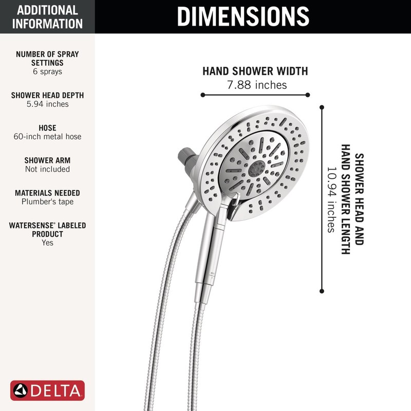 Delta Faucet 6-Setting In2ition 2-in-1 Dual Shower Head with ProClean Spray, Chrome Round Shower Head with Hose, Hand Held Shower Head, Chrome 75655