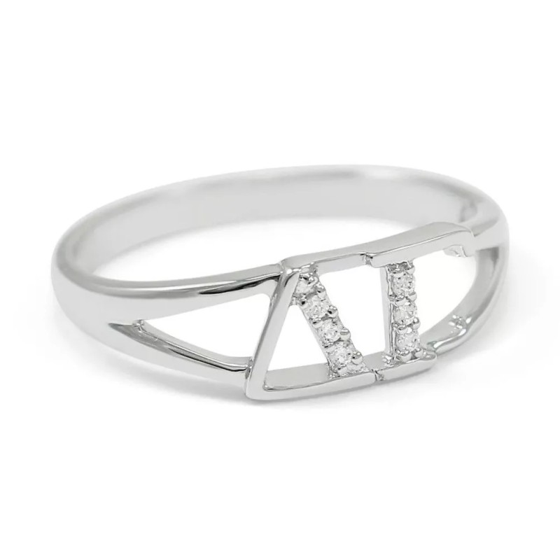 You are purchasing a gorgeous sterling silver Delta Gamma ring. Made with 925 sterling silver and simulated diamonds on the Greek letters. Hand-polished to a brilliant shine. Made exclusively by our company, it is elegant and dainty, and perfect for all occasions!