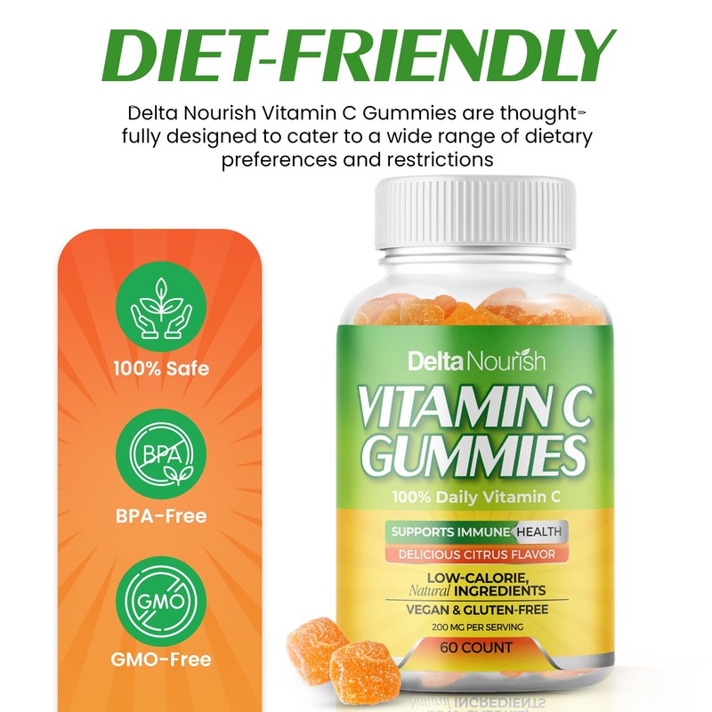 Support Your Immune Health with Tasty Vitamin C Gummies Get daily immune support with Delta Nourish Vitamin C Gummies, formulated with a high potency 200mg dose of Vitamin C per serving. These delicious citrus gummies make it easy to stay healthy and get your daily Vitamin C without the hassle of swallowing pills. Vitamin C is more than just immune support — it's also a powerful antioxidant, helping to protect cells from oxidative stress and supporting collagen production for skin health. Whether you're looking to stay strong during cold and flu season or simply want to enhance your daily wellness, these gummies are a tasty, convenient solution.