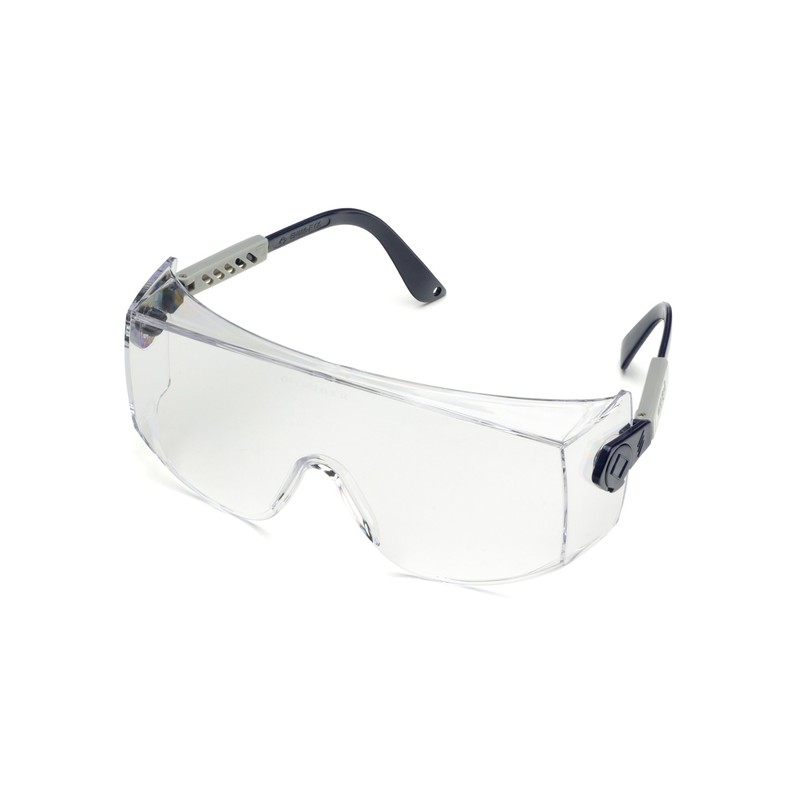 OVR-Specs are designed to fit over prescription glasses. Elvex offers OVR-Spec (SG-27) with angle and length adjustable temples. This style fits over large prescription glasses.
