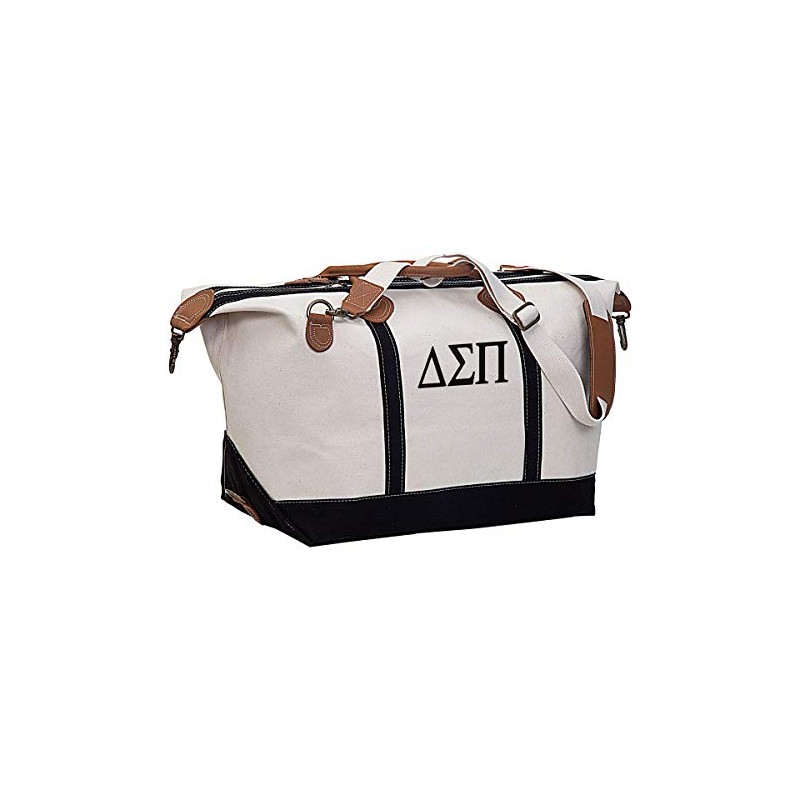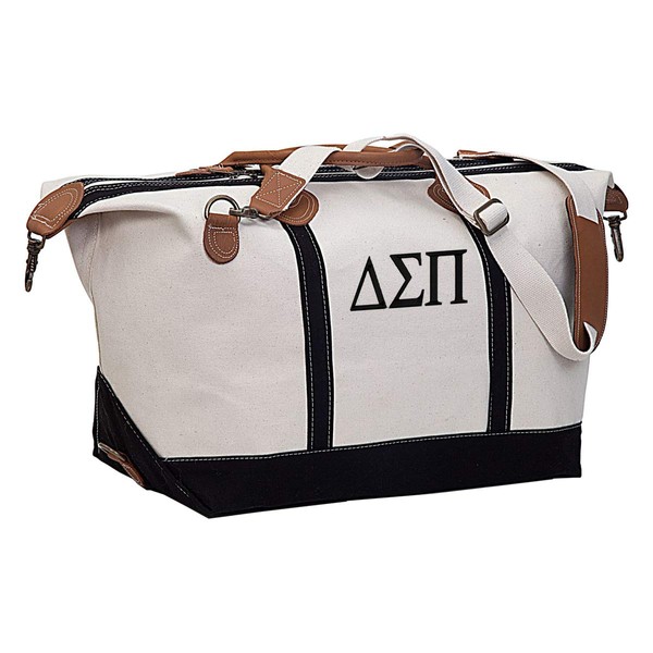 - Natural and Black Canvas Duffel with Delta Sigma Pi letters embroidered in black thread