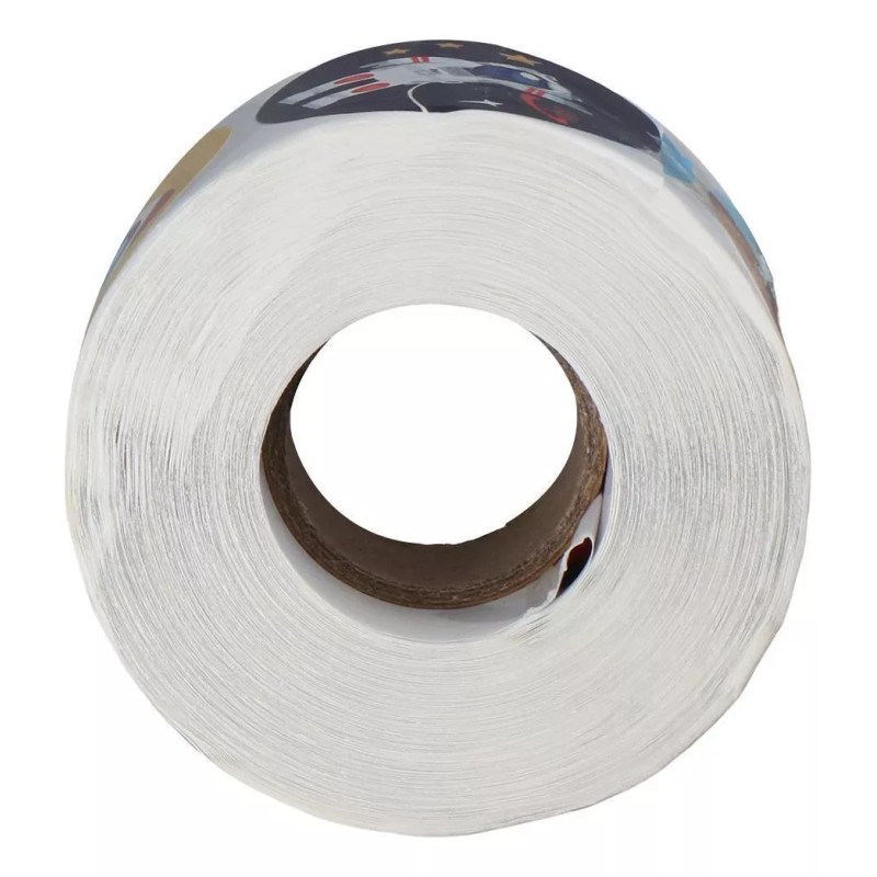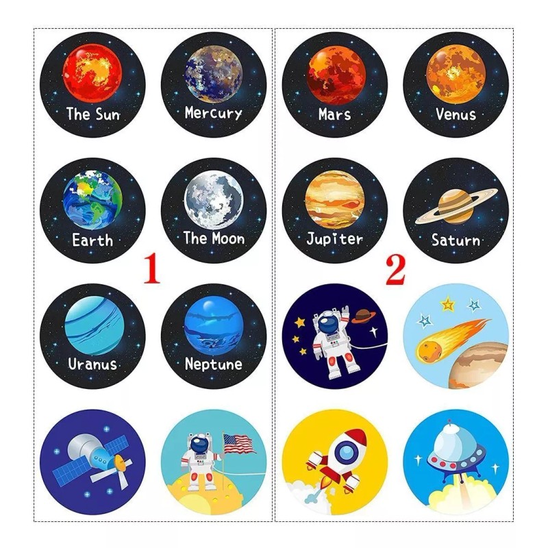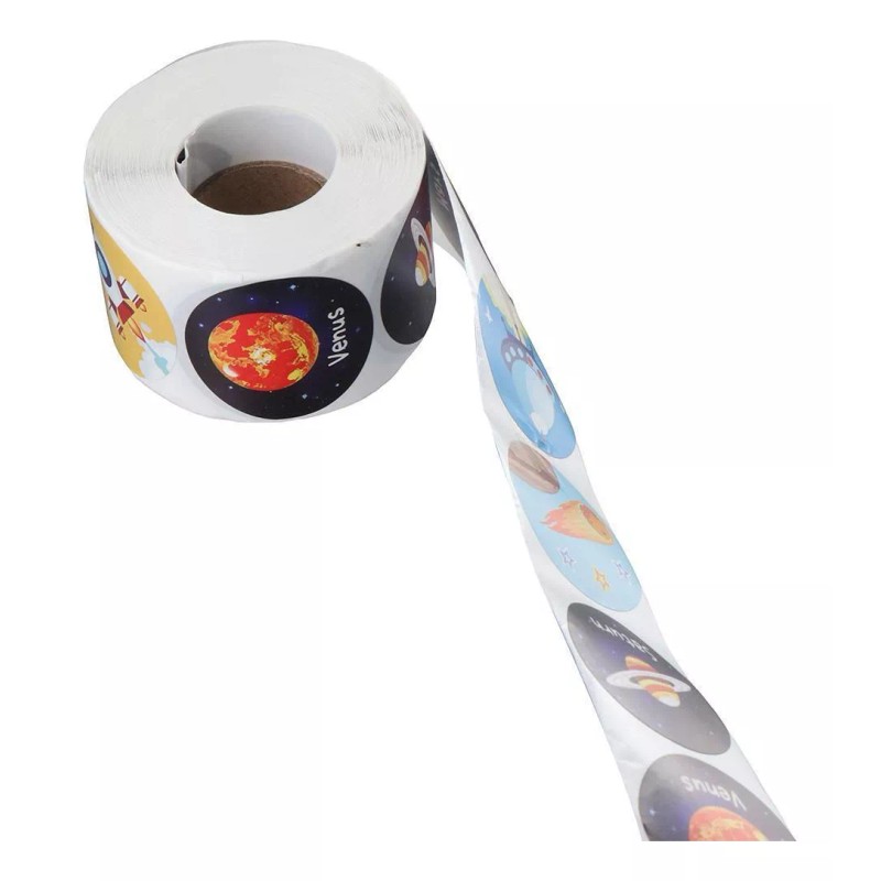 Y otro rollo con 500 stickers de: marte, venus, júpiter, saturno, astronauta, cometa, cohete y nave espacial.