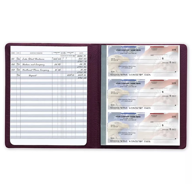 Item Number 56202 Replacement check register for Deluxe Deskbook Check Systems Item is a set of 5 registers to a package 27 pages per register and listing up to 30 entries per page Size: 6 3/8 x 8 1/4 Checks and Cover sold separately |