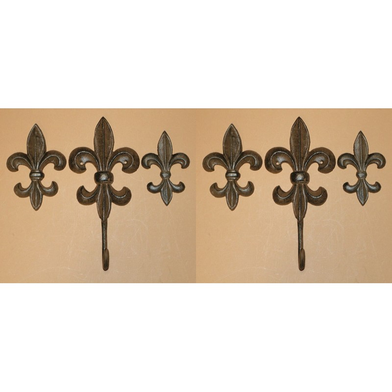 - Two Fleur de Lis emblem plaques for wall decor coordinates with the large Fleur De Lis wall hook to hold big bathrobes. Solid cast iron, three-dimensional design on the front.