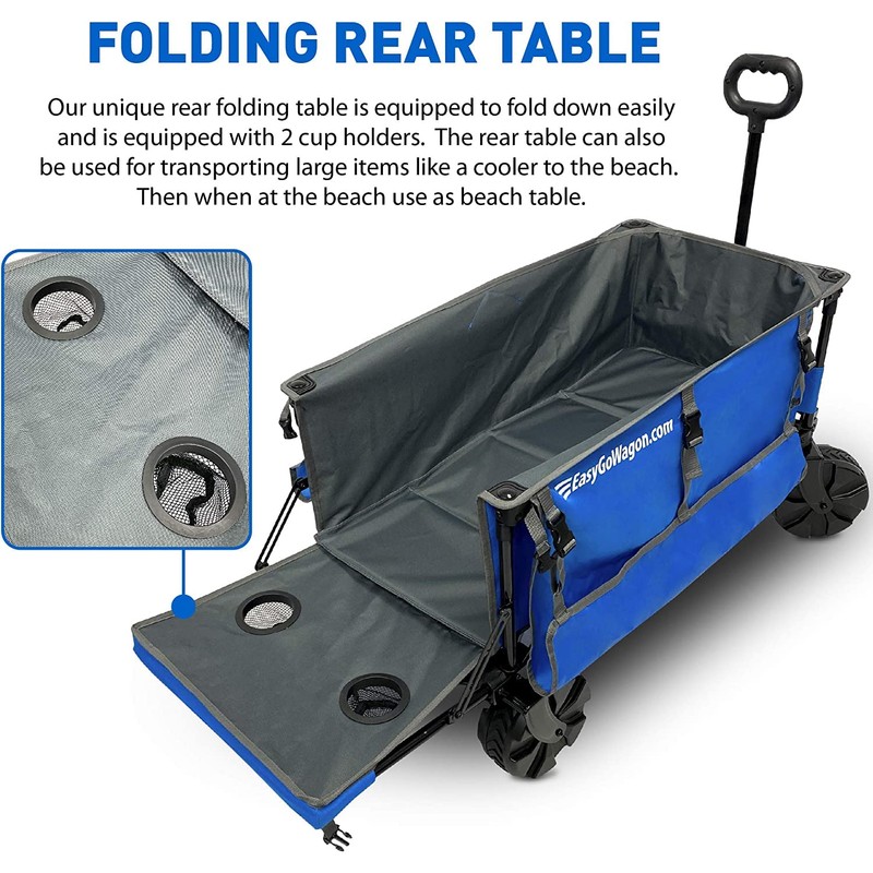 • Folding Rear Table – Our unique rear folding table is equipped to fold down easily and is equipped with 2 cup holders. The rear table can also be used for transporting large items like a cooler to the beach. Then when at the beach use as beach table.