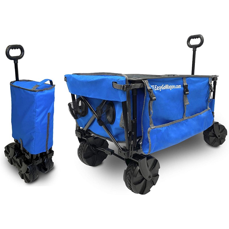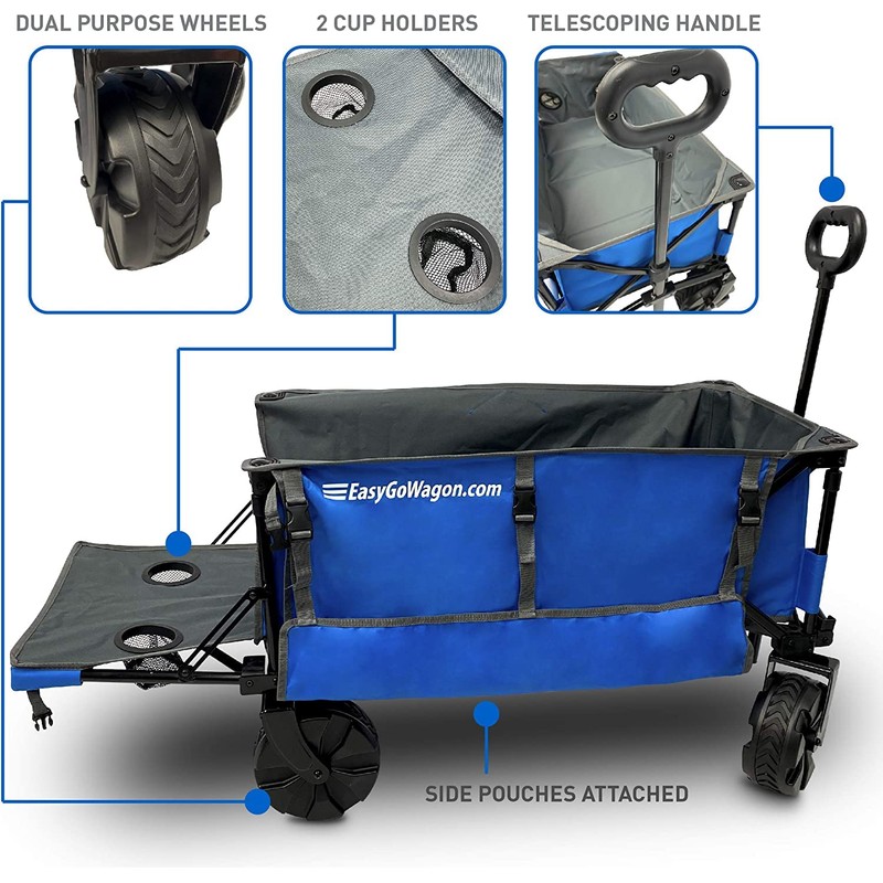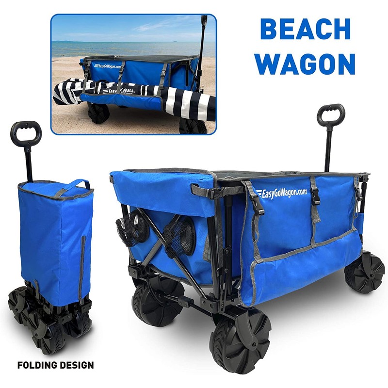 Deluxe Folding Beach Wagon – Big Wheel Beach Cart w/Folding Beach Table and Side Umbrella Holders Blue