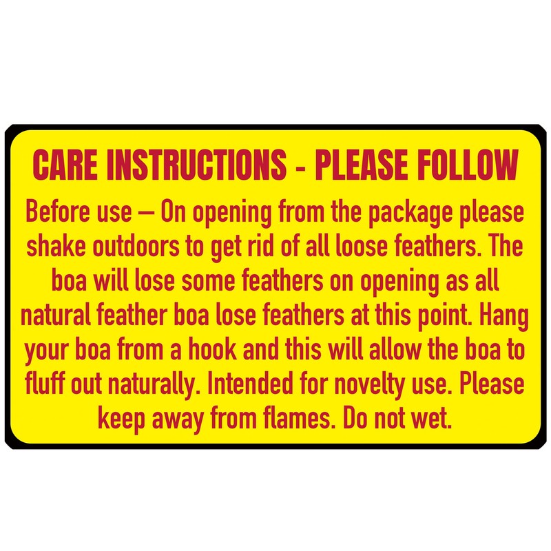 • Care Instructions: PLEASE FOLLOW CARE INSTRUCTIONS. When your boa arrives open the bag, preferably outdoors, to get rid of any debris formed by shipping and processing, give it a shake and hang from hook. The boa will lose some feathers at this point as all natural feather boa do. Then hang your boa from a hook as this helps it fluff out naturally. The longer you hang the boa the more it will fluff out. Do not wet.