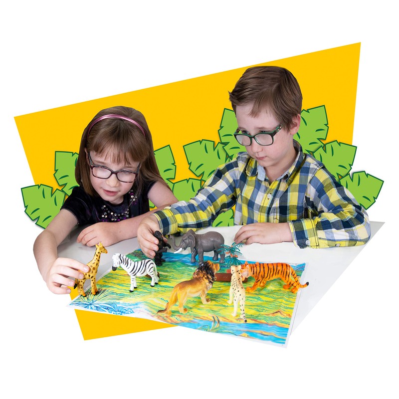 - JUNGLE PLAYSET - 9 piece playset of safari animal toys for kids including a playmat. This jungle toys set includes includes a Tiger, Lion, Giraffe, Elephant, Gorilla, Cheetah and other jungle accessories.