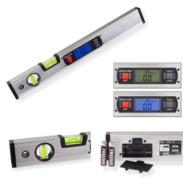 Spirit Level, digital angle meter with extra features, lit LCD Multi Display with digital support (hold function, tilt display, angle aid), aluminium body with magnetic holder.
