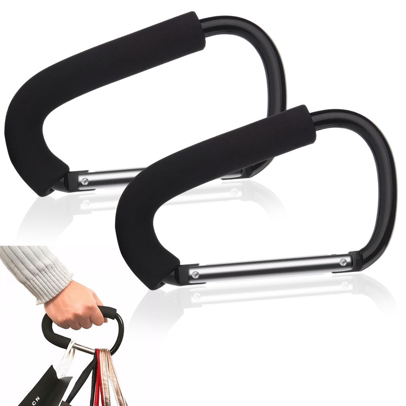 - Universal fit: pram hooks for most pushchairs. The carabiner with foam can also be easily used as a handle to hold plastic bags to prevent the plastic from cutting into your hands. Do not overload the pram hooks for changing bags, which can lead to tipping over.