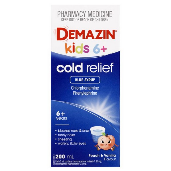 Demazin Kids 6+ Cold Relief Blue Syrup relieves blocked nose & sinus, runny nose, sneezing and watery, itchy eyes.