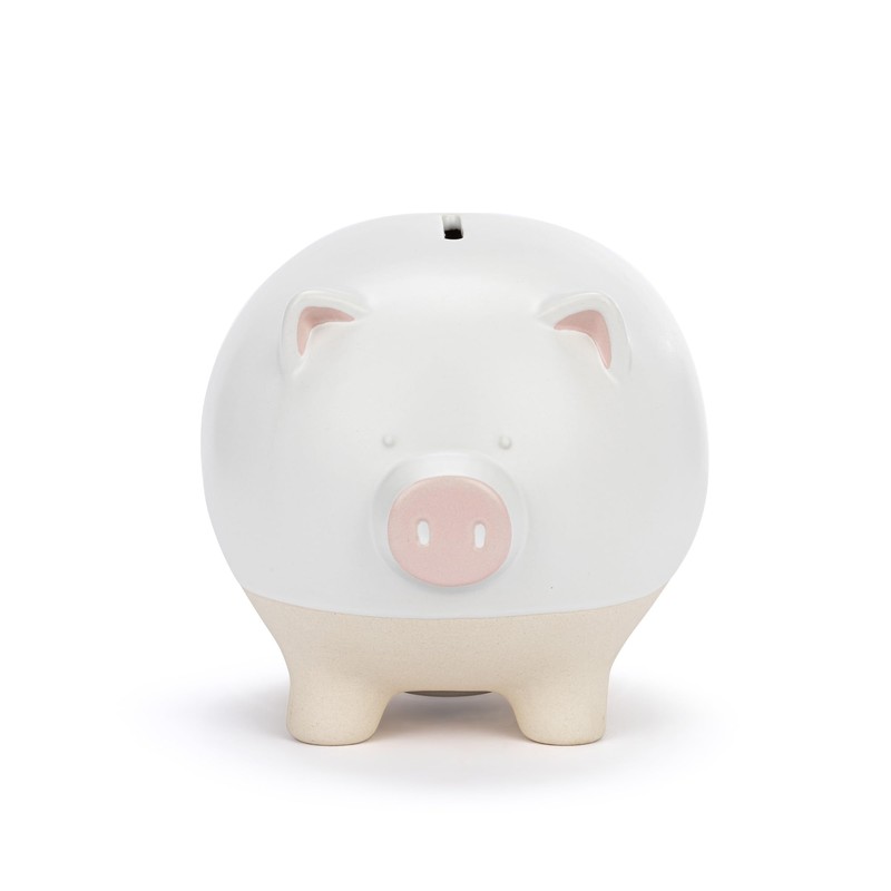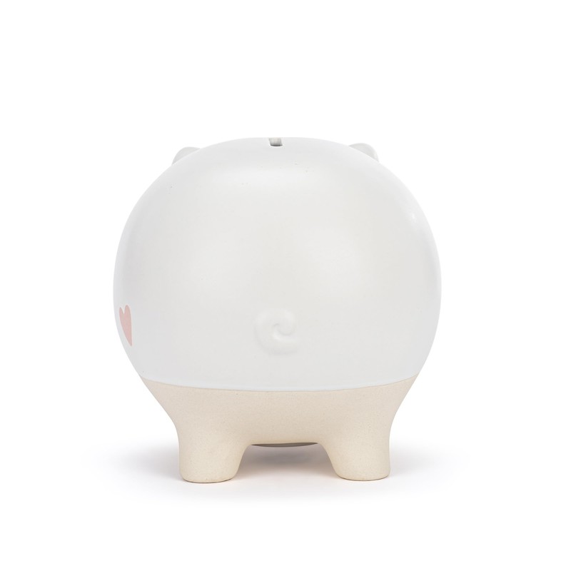 • Handcrafted bank features a classic white finish with pink accents and a stoneware bottom; Serves as a way to help parents teach children about the importance of saving