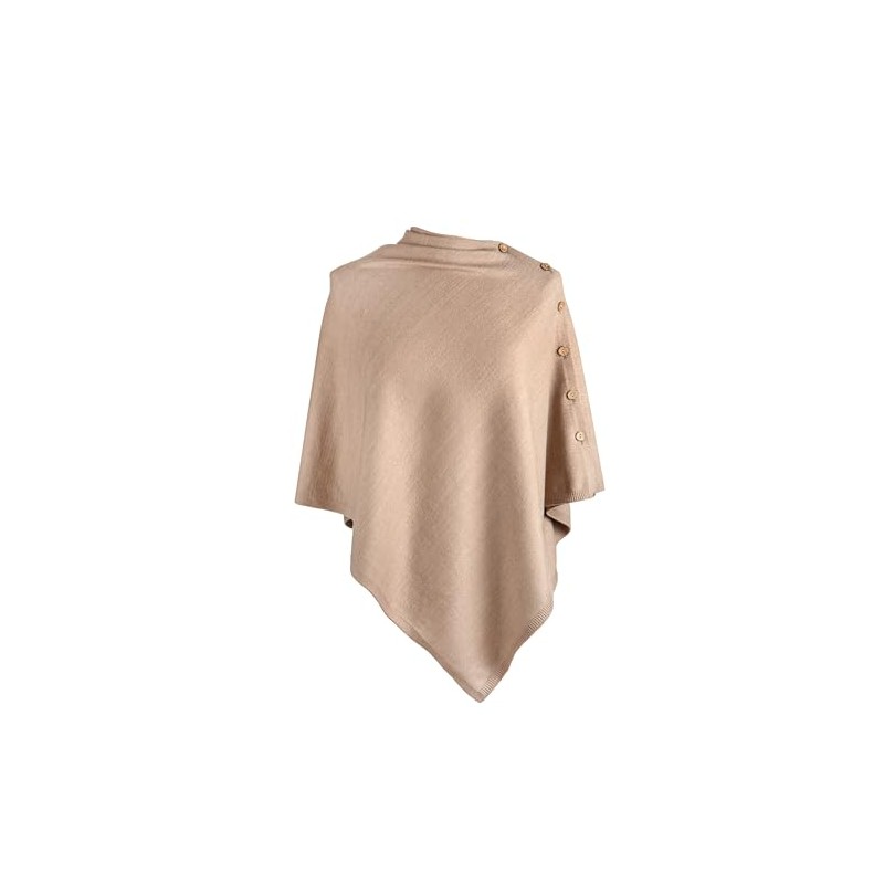 - Elevate your style and embrace effortless comfort with this elegant and versatile poncho wrap; Features a beautiful beige color with a row of natural-look buttons along one side