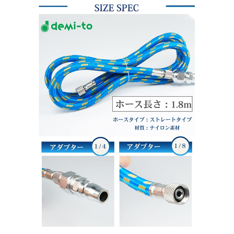 - 5. Product Specifications: Hose Length: 5.9 ft (1.8 m). Material: Nylon material. Set Contents: Hose x 1, Adapter x 2 (1/8, 1/4). Hose Type: Straight type. Depending on the production period, the hose specifications may differ from the image. ✔ [Beware of imitations! ) Recently we report customers that counterfeit products are sold by demi-to. Only products purchased from the "demi-to" authorized seller can be guaranteed. Please be careful to make sure you do not buy it by mistake