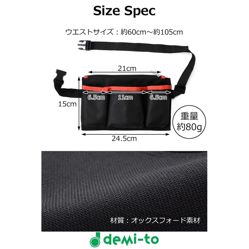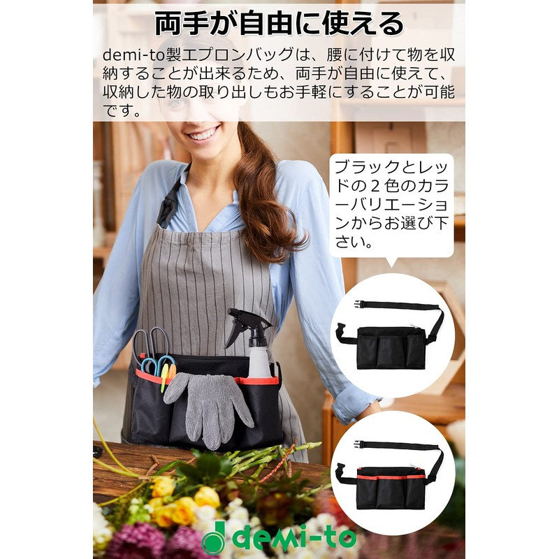 - 1. Demi-to Apron Bag: The apron bag can be attached to your waist to store items, so you can use both hands freely, and you can easily remove the stored items. The "demi-to" apron bag is lightweight and has a simple design. Available in 2 color variations between black and red, so please choose the one that suits your preference