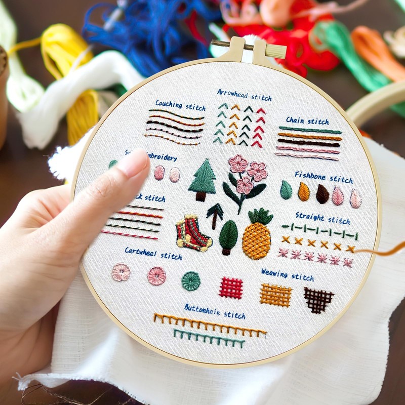There are 30 different stitches to practice, and each stitch in the set has been practised several times, so even beginners can master the technique. The embroidery cloth has colorful patterns, the embroidery thread is glued to the card, and there is an adjustment screw on the embroidery hoop, which is very helpful for beginners.