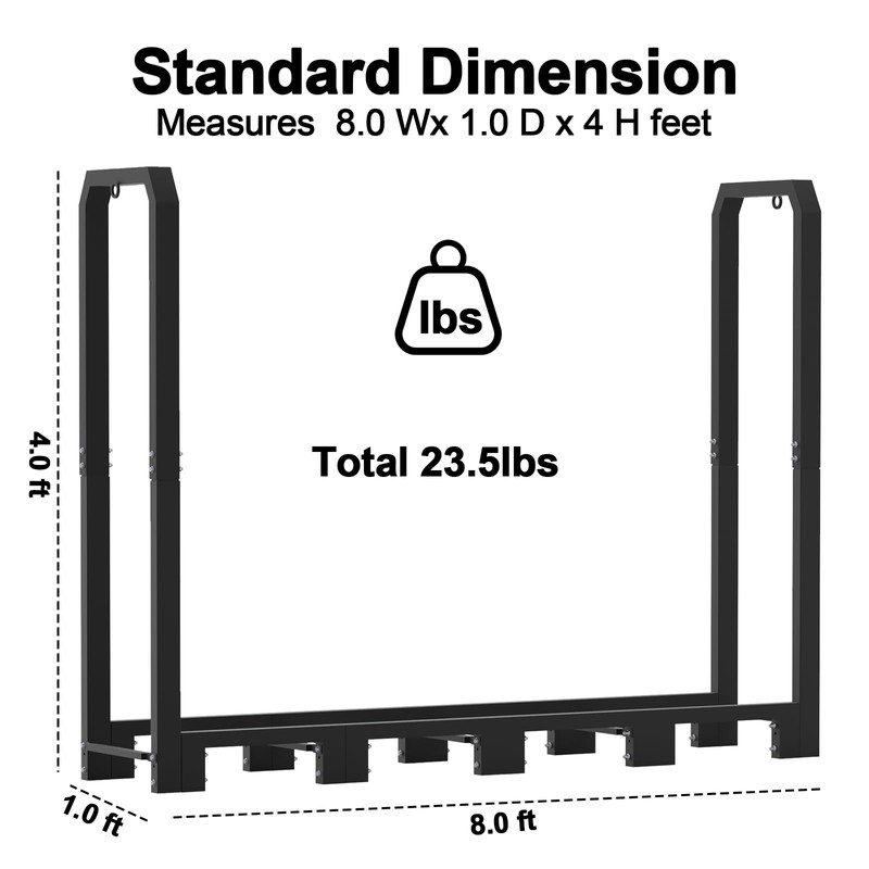 - Heavy-duty material: The 8Ft firewood storage rack is made of multiple heavy-duty metal pipes with a rust-proof coating on the surface. You can freely combine the required lengths and sizes. You can place the rack in hot, cold, or dry climates to store enough wood anywhere you need.