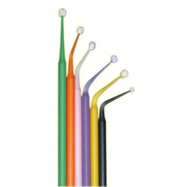 Single bending fiber tip applicator. Tapered head design and shape allow placement of any solution or material into areas of limited access. Head composed of micro non-lint fiber tips. Solutions are held in suspense in non-dripping sphere until applied. Neck and handle bendable to suitable angles.