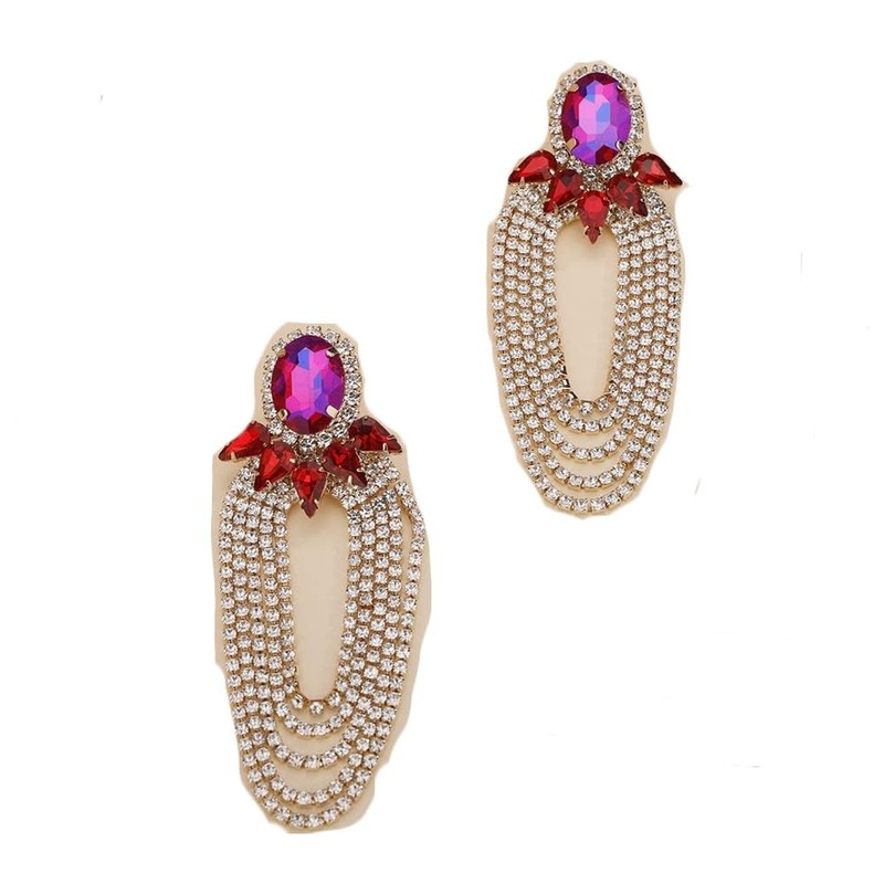 Denifery Rhinestones Long Tassel Earrings Layered Dangle Hoop Earrings Sparkling Crystal Bling Stud Earrings for Bridal Party Women and Girls (Rose Red)