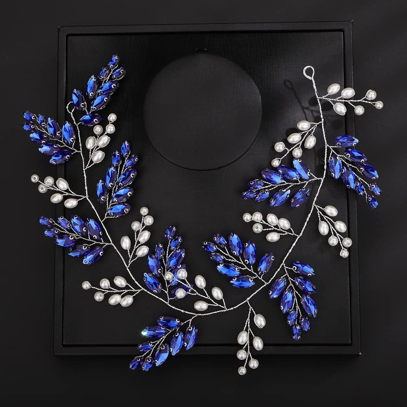 Denifery Wedding Crystal Pearl Hair Vine Bridal Rhinestone Headband Handmade Wedding Headpiece Crystal Hair Pieces Hair Accessories for Bride Women Girls (Deep Blue)