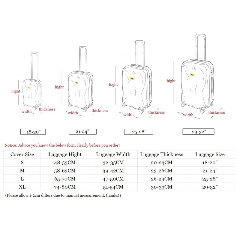 - Fit quickly and easily in seconds. Durable and washable, 4 sizes available to fit almost any luggage. S: fit 18-20 inch luggage, M: fit 21-24 inch luggage, L: fit 25-28 inch luggage, XL: fit 29-32 inch luggage.