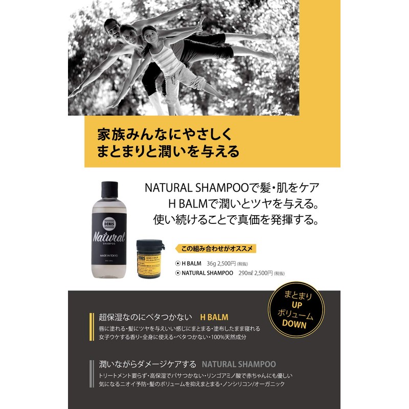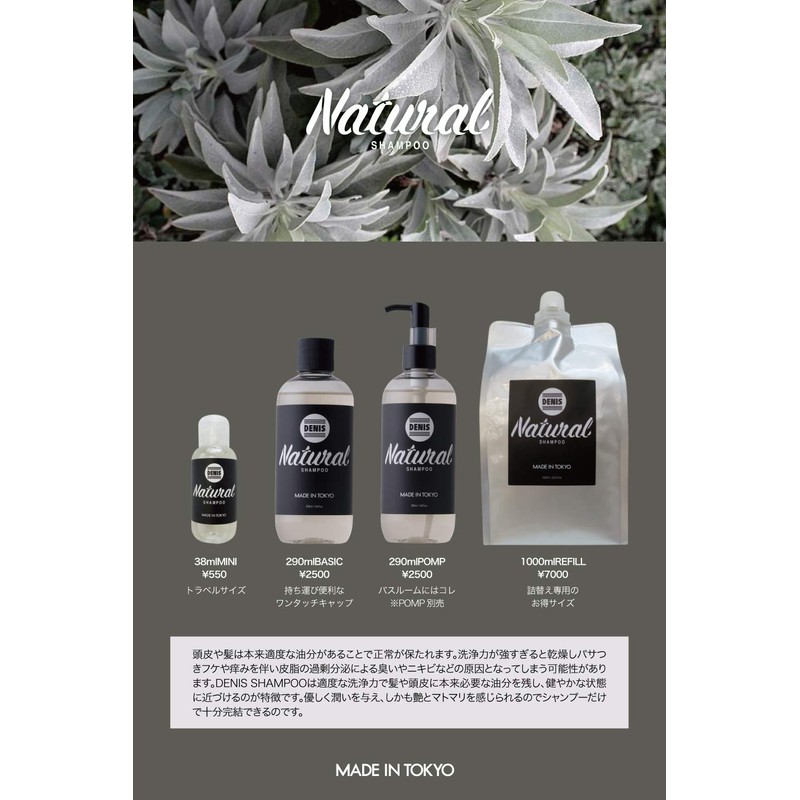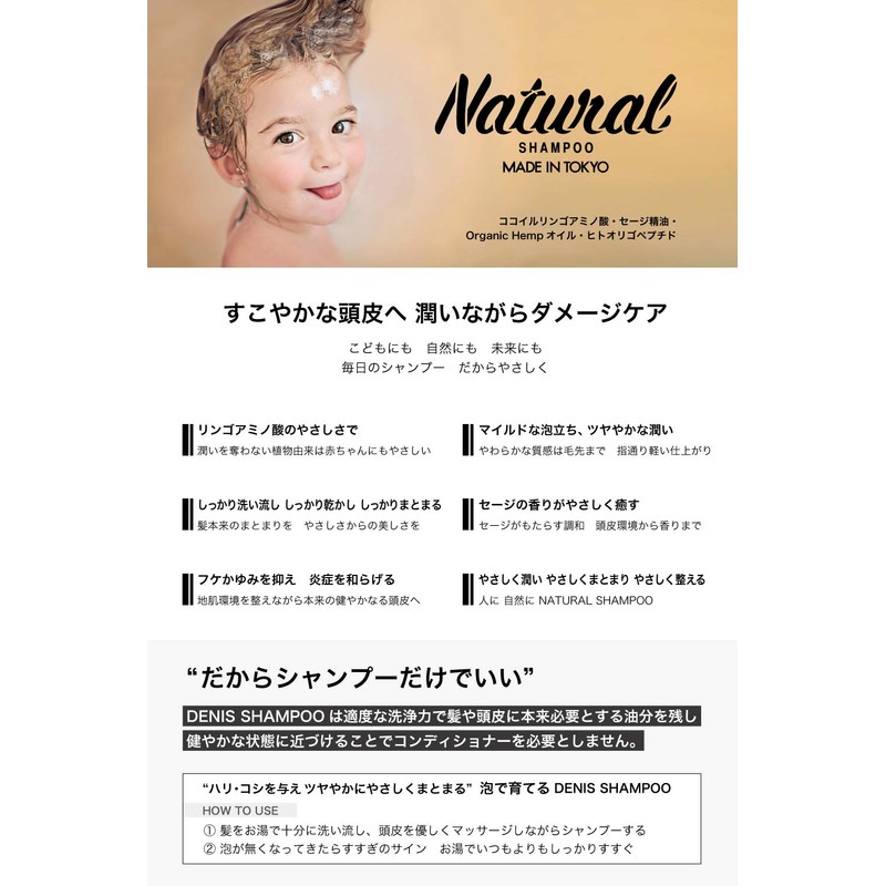 The scalp and hair are naturally maintained by moderate oil.Too strong cleaning power can cause odors and acne caused by excessive secretion of sebum with dandruff and itching.DENIS SHAMPOO is characterized by moderate cleaning power to leave the necessary oil on the hair and scalp and close to a healthy condition.Gives firmness and shiny. Because you can feel the matomari, only shampoo can be completed.