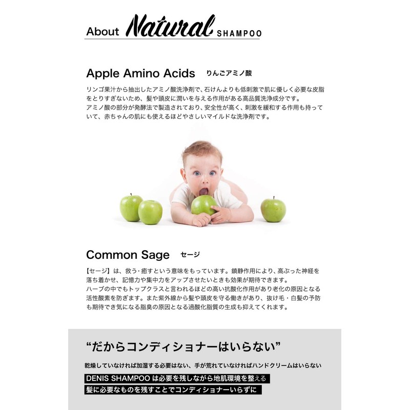 DENIS NATURAL SHAMPOO 10.2 fl oz (290 ml), Apple Amino Acids, Gentle for Kids, Made in Tokyo, Natural Shampoo, Foaming and Sage Essential Oil Incense, Gently Consistent Conditioner, No Damage Care while Moisturizing