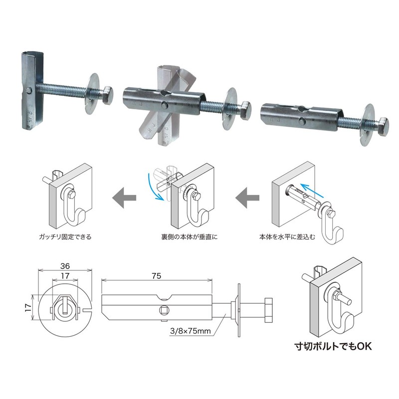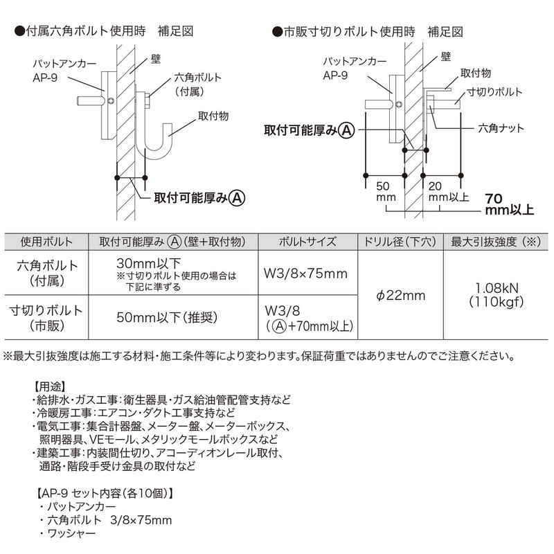 - AP-9 Set Contents (10 pieces each): Pat Anchor, Hex Bolt, 0.1 x 3.0 inches (3/8 x 75 mm), Washer