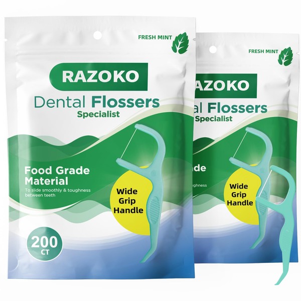 RAZOKO Dental Floss Picks | Toothpick, Shred-Resistant Floss, Easy Grip Handle, Fresh Mint Flavor, 400 Count (Pack of 2)