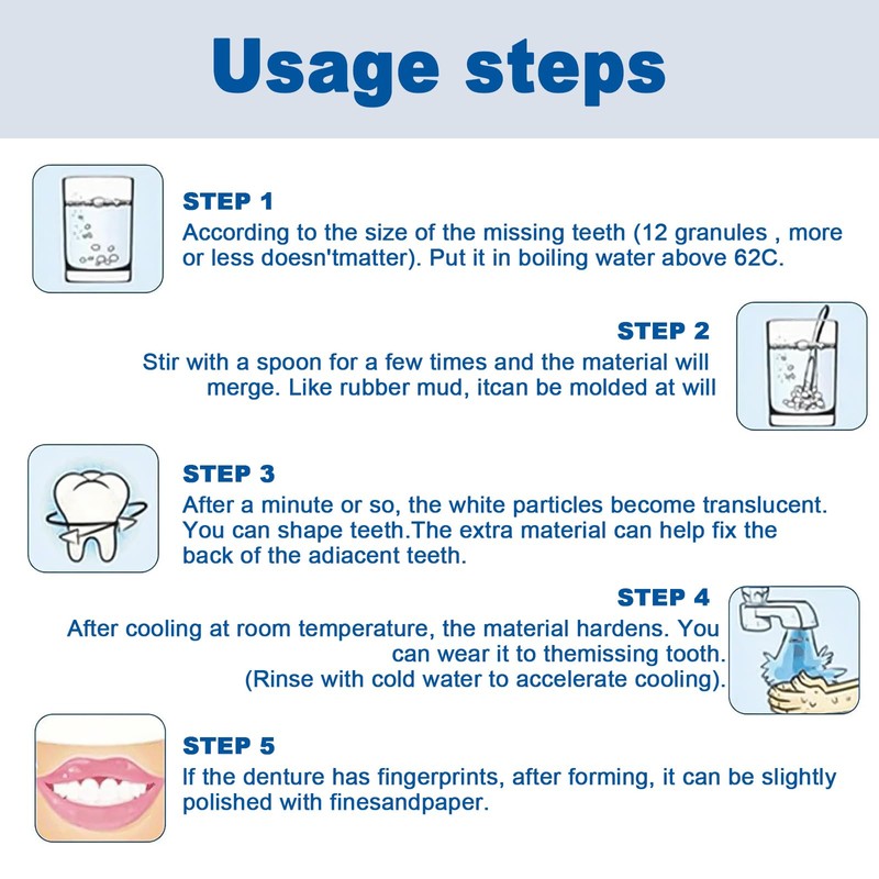- Easy to use: dentures are simple and easy to use and requires no special skills or additional tools for dental restoration. Simply place dentures in boiling water for a few minutes and then use the tool to adjust the shape and size of the tooth repair kit to your needs. The adapted tooth repair set is placed in the desired place to get a stable filling.