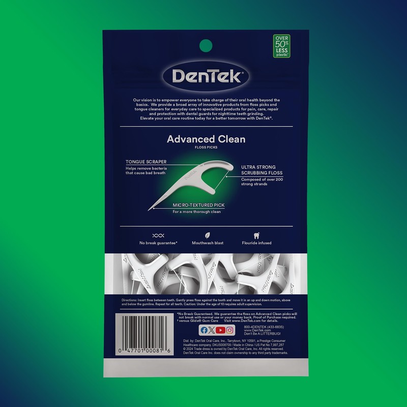 DenTek Triple Clean Advanced Clean Floss Picks have our thinnest, strongest floss that won't break or shred. The floss on DenTek Triple Clean Advanced Clean Floss Picks is composed of over 200 individual cleaning strands. The micro-textured pick helps to scrape away stubborn bits of food and plaque, and the tongue cleaner helps to fight bad breath. DenTek Triple Clean Advanced Clean Floss Picks feature Mouthwash blast flavored floss with fluoride-infused floss strands. While your teeth may feel clean after using a toothbrush and toothpaste, they're not fully clean without cleaning the spaces between teeth where food and plaque tend to remain. Use DenTek Triple Clean Advanced Clean Floss Picks to remove plaque and bits of food that often stay stuck between your teeth. Help prevent tooth decay and tooth stains by flossing after every meal. DenTek Triple Clean Advanced Clean Floss Picks come with a floss no-break assurance – DenTek assures the floss on DenTek Triple Clean Advanced Clean Floss Picks will not break with normal use or your money back*. DenTek Floss Picks are the first floss pick to be accepted by the ADA. Go beyond brushing with DenTek! We have an unparalleled array of advanced dental technology to help preserve and protect your teeth for a lifetime. *Proof of purchase required.