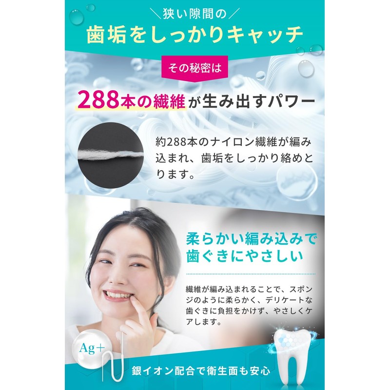 - Securely catches dental plaque in narrow spaces: Approximately 288 fibers are woven into a floss that catches dental plaque. This is why it is the purpose of removing plaque