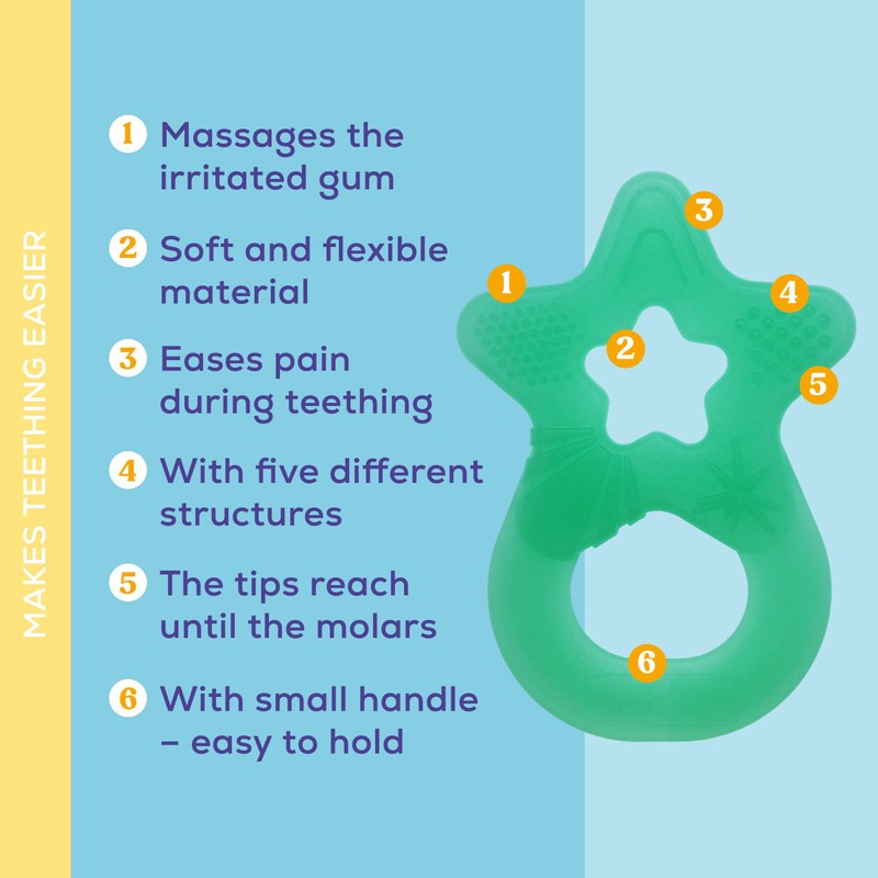 - Soft Baby Teething Ring - The soft star shaped ring not only serves as a pain-relieving baby teething aid, but actively promotes the child's motor skills and makes chewing fun.