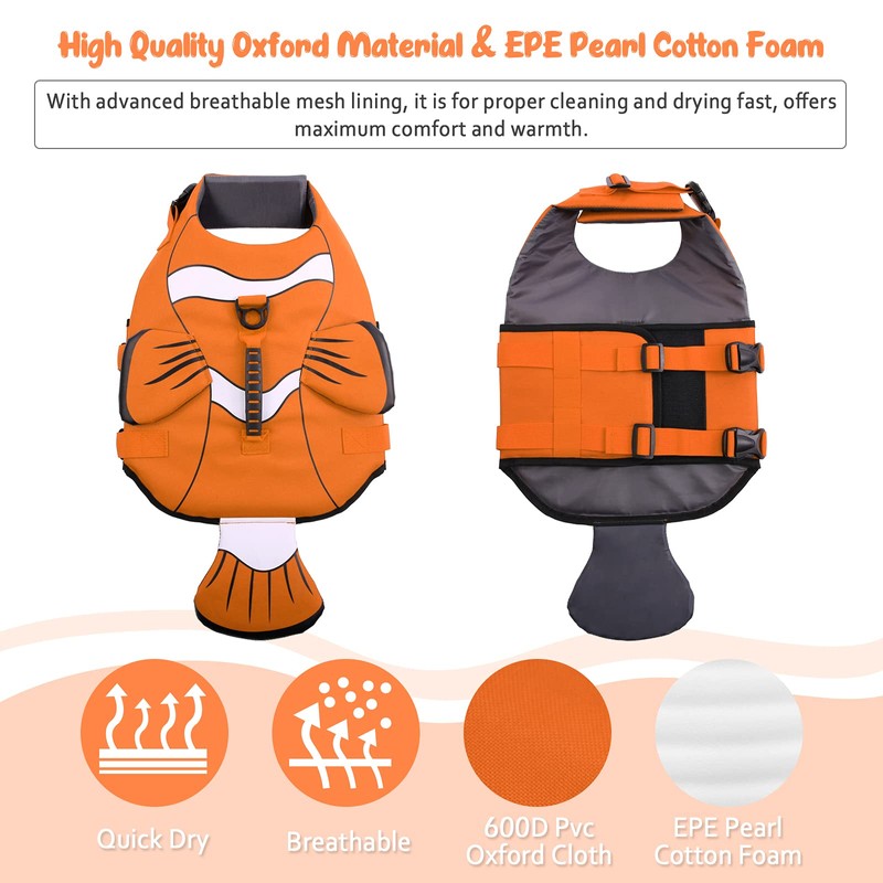 - High-Visibility Dog Life Jacket: This clownfish-shaped flotation vest features bright, conspicuous colors that enhance visibility in water, particularly in low-light conditions. Designed with water safety as a priority, this buoyancy coat ensures your dog can safely enjoy aquatic adventures during outdoor activities