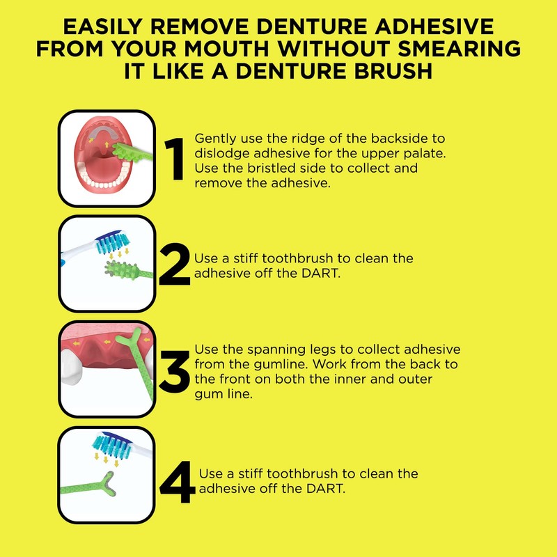 - EASY ADHESIVE REMOVAL: Instead of using basic denture brushes for dentures, the Denture Dart makes removing stubborn powder adhesive a breeze! Use the Denture Dart from the back of your mouth to the front, dislodging adhesive from inner and outer, upper and lower, gum line, and remove with the bristled head.