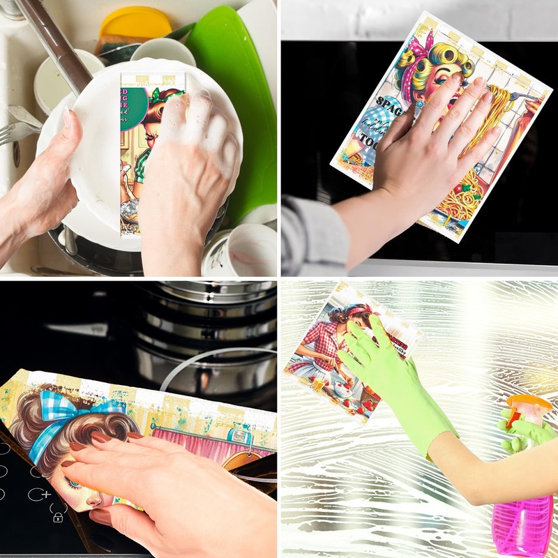 - Unique Sarcastic Designs: Each cloth showcases a different humorous scene with a housewife, offering a playful and unique design that stands out in any kitchen decor
