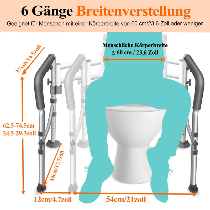 - Adjustable Design Fit Most Toilets: Easily adjustable with spring buttons to fit most elderly toilet seats. Our assistive rails can be adjusted to the height and width for your needs. Height adjustable from 25-31 inches(65-77cm), width adjustable from 21-25 inches(54-64cm)