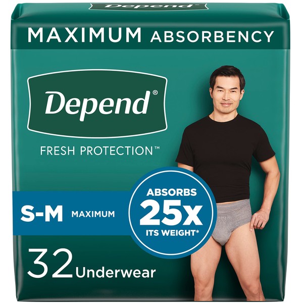 Depend FIT-FLEX Incontinence Underwear for Men, Maximum Absorbency, Disposable, S/M, Grey, 32 Count