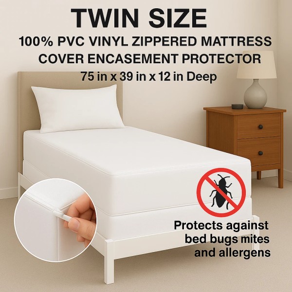 Twin Size Heavy Duty Vinyl Mattress Cover – Zippered, Waterproof, 12" Deep