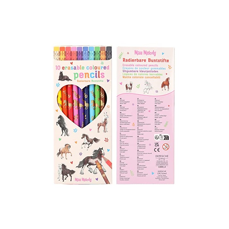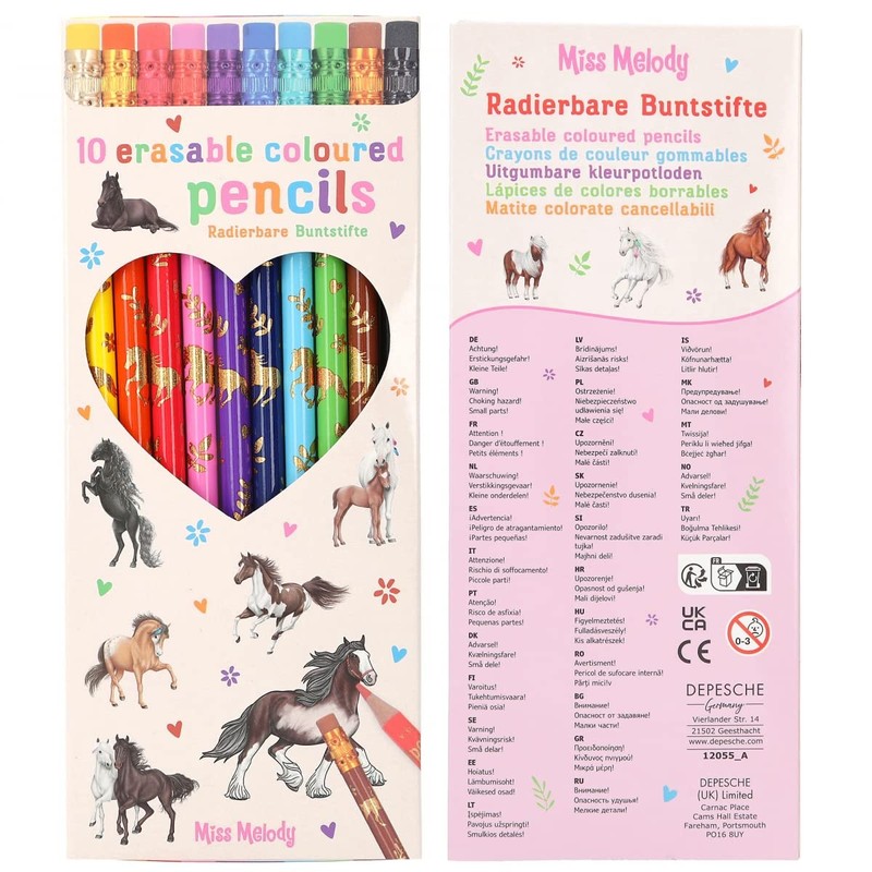 Depesche 12055 Miss Melody Colouring Pencils Set with 10 Colours in Case Includes Eraser Topper on Each Pen for Colouring at School and Leisure Yellow, Gold, Orange