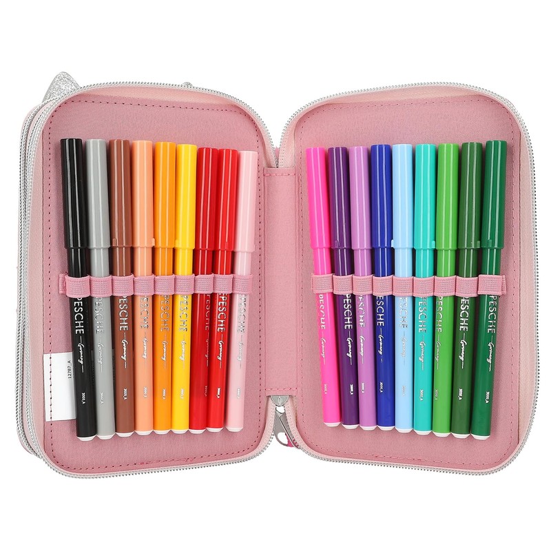 - Filled with 18 coloured and felt tip pens, 2 pencils, eraser, sharpener, ruler, scissors, glue stick and a small Velcro pouch