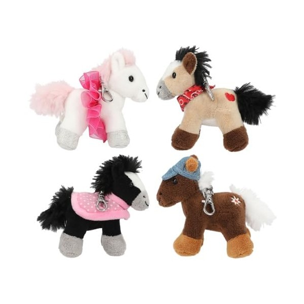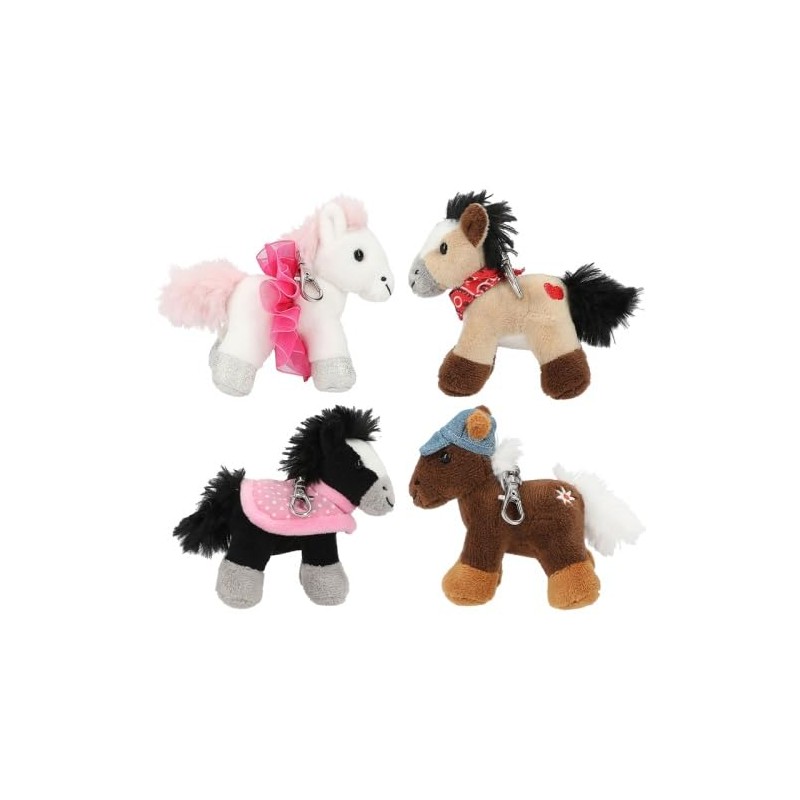 Mini horses bring great joy: the small plush horses on the carabiner can be attached to the bag or school bag. Four different designs: white horse with silver glitter hooves and pink tutu, dark brown horse with denim hat and flower embroidery, beige horse with red bandana scarf and heart embroidery and black horse with pink polka dot blanket. Material: 100% polyester.