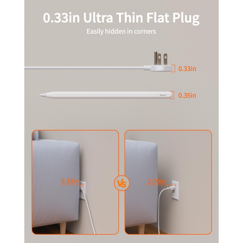 - 【Ultra Thin Flat Plug & 3Ft Extension Cord】- With only a 0.33-inch ultra-thin plug, which is much slimmer than traditional plugs, so it's easier to access any wall socket and hide in the back of the sofa. And a 45° right-angle design will not block the bottom receptacle of your duplex wall outlet. The 3-foot flat cable is 50% thinner than the traditional power cords to run it under a rug or along walls.