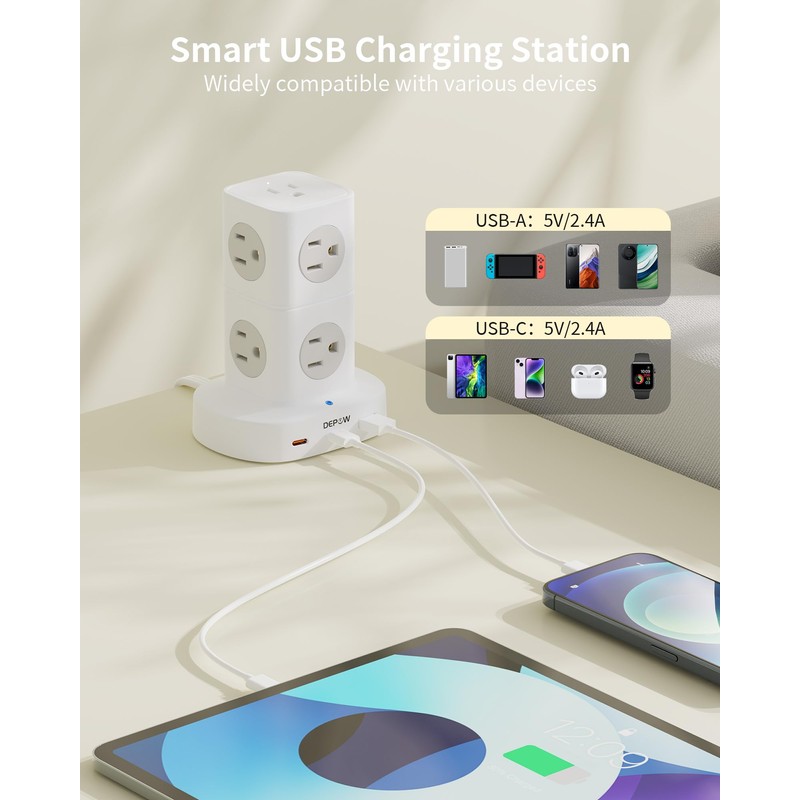 - 【Smart USB Charging Station】It provides abundant space to plug in all your electronic devices. The power strip tower also features 3 USBs (2 USB-C Ports) with a shared output of 2.4A/12W, ensures optimal charging performance for your devices. Allowing you to charge multiple devices at once.
