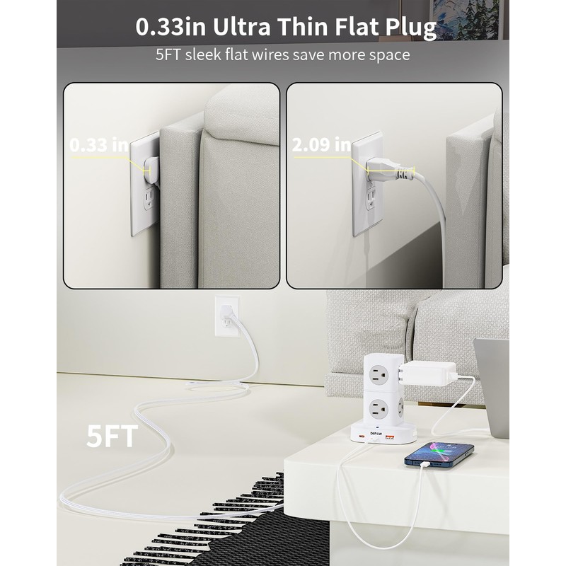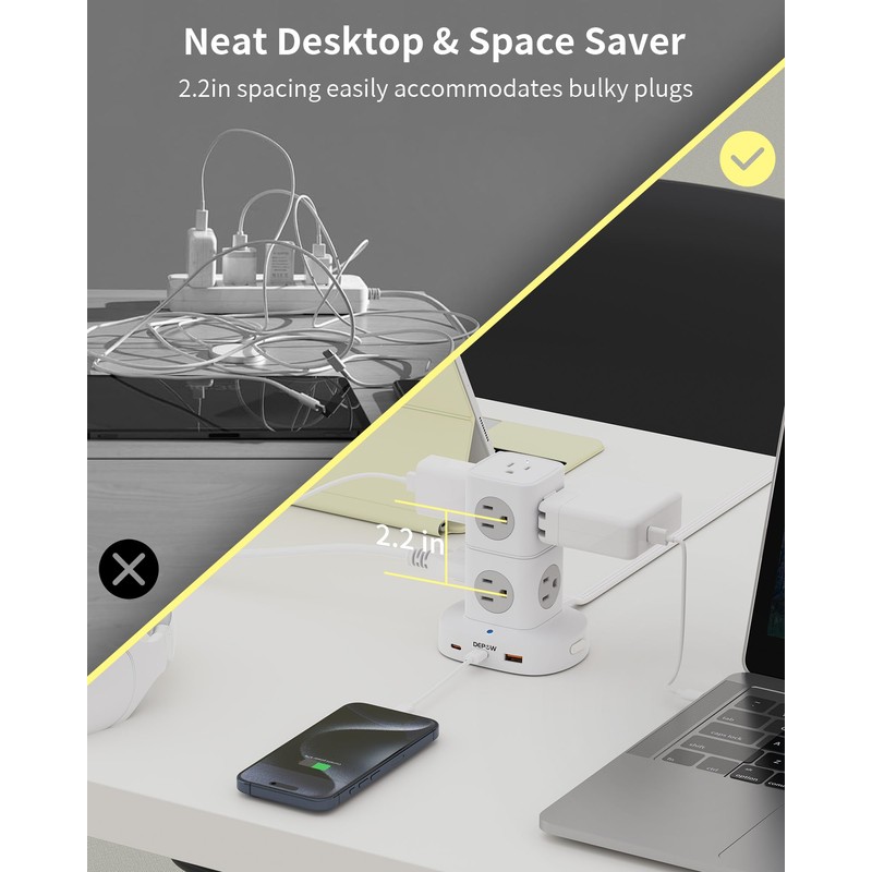 - 【Inverted for Tidier Use】The wide spacing between the outlets measuring 2.2in, prevents wire entanglement. Additionally, the vertical design can be used upside down to save even more space. With the included screws, this small tower strip can be securely mounted for stability.