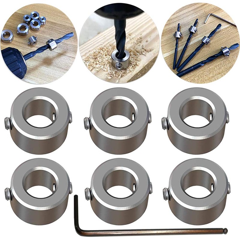 Depth Stop Rings Set, CESFONJER Depth Limiter Drill Ring Positioner (ID: 7 mm, 6 Pieces) with Hex Key for Drill Woodworking