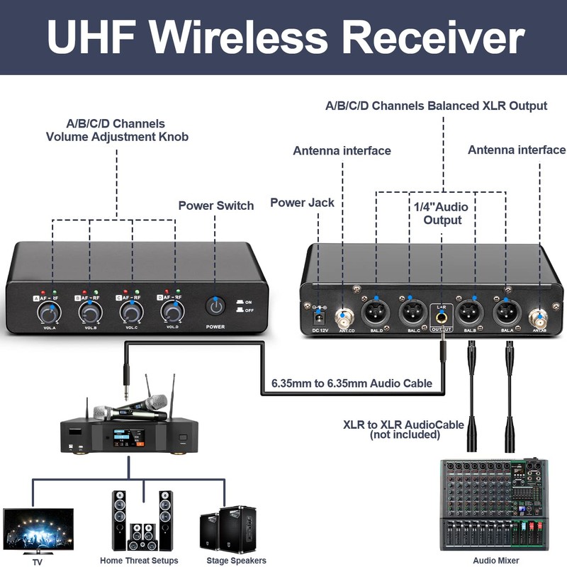 - The 4 channel microphone is metal receiver, has a 1/4-inch audio output jack and four XLR output jacks for compatibility and connection to more audio equipment, such as mixers, amplifiers, active speakers or other devices with 6.35MM microphone jacks Audio equipment.